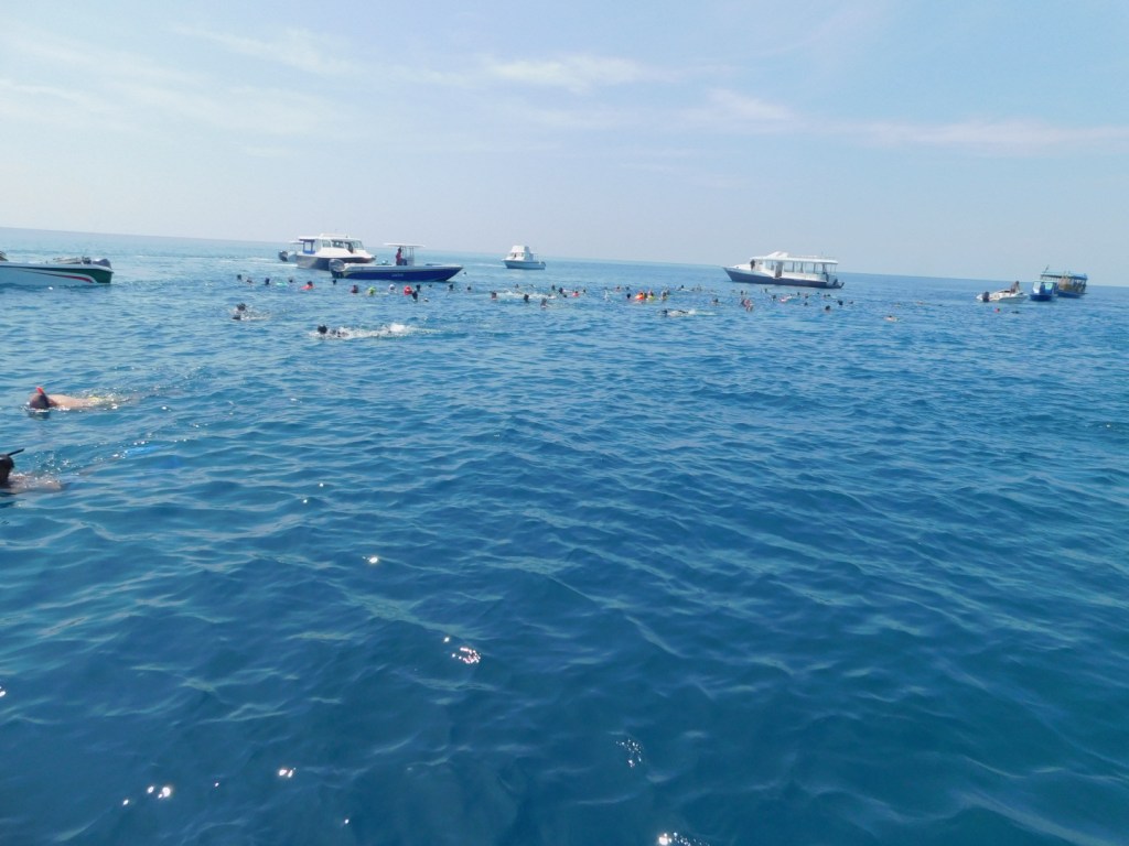 Der Menschenandrang und das Gewusel im Wasser war unglaublich. Alles was sich halbwegs über Wasser halten konnte, versuchte einen Blick auf den Walhai zu erhaschen. Wilde Wasserschlacht, Gedränge mit Armen, Beinen, Flossen und Kameras.
