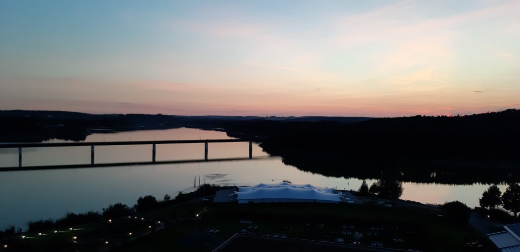 Die Zeit rennt und unser Ziel ist noch fern. Durch undurchsichtige Kiefernwälder, bergauf, bergab, durch winzig kleine Dörfer mit verschieferten Häusern geht es im Eiltempo immer weiter östlich. Bis sich die Landschaft verändert, die Wälder sich mit riesigen Weizenfelder abwechseln, Berg und Tal leicht hügelig wird. Willkommen im Thüringer Vogtland. Mit den letzten Lichtstrahlen des rotverfärbten Himmels erreichen wir unser Ziel: das Zeulenrodaer Meer. sis