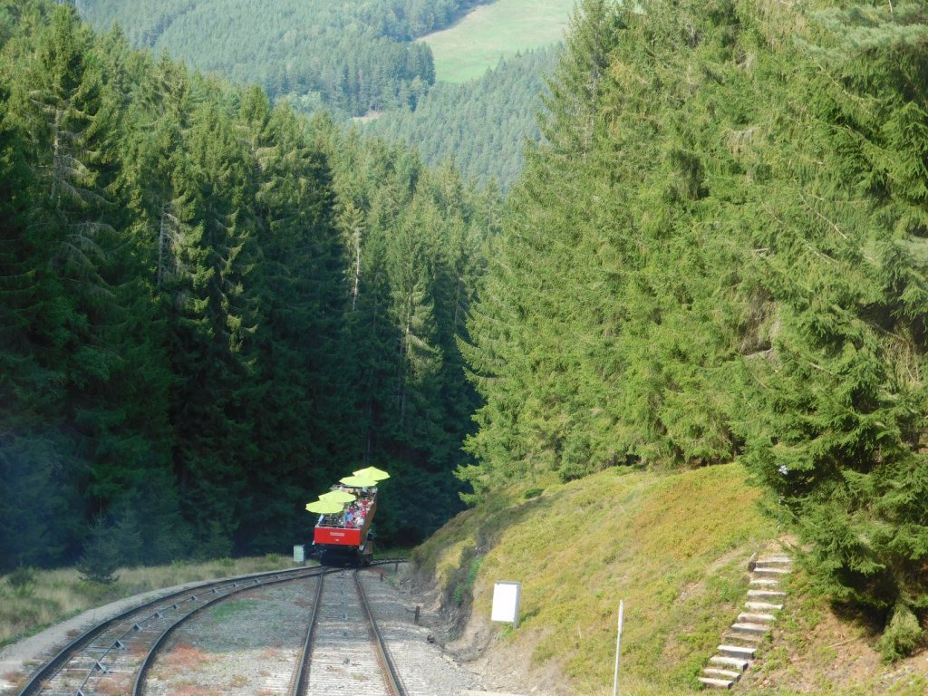 Das Wetter ist prima, eine spätsommerliche Hitzewelle steht an und wir steuern auf unzähligen kleinen Straßen unserem Zwischenziel entgegen: der Oberweißbacher Bergbahn. 1919 eröffnet, geht es per Seilwinde 1200 Meter steil den Berg hinauf. Wir erwischen den Capriowagen und lassen uns gemütlich den Berg hochziehen. Sehenswert auf alle Fälle, sein Essen und Trinken sollte man aber mitbringen. Trotz viel Geduld unsererseits mussten wir durstig den Berg hoch und wieder hinunter.