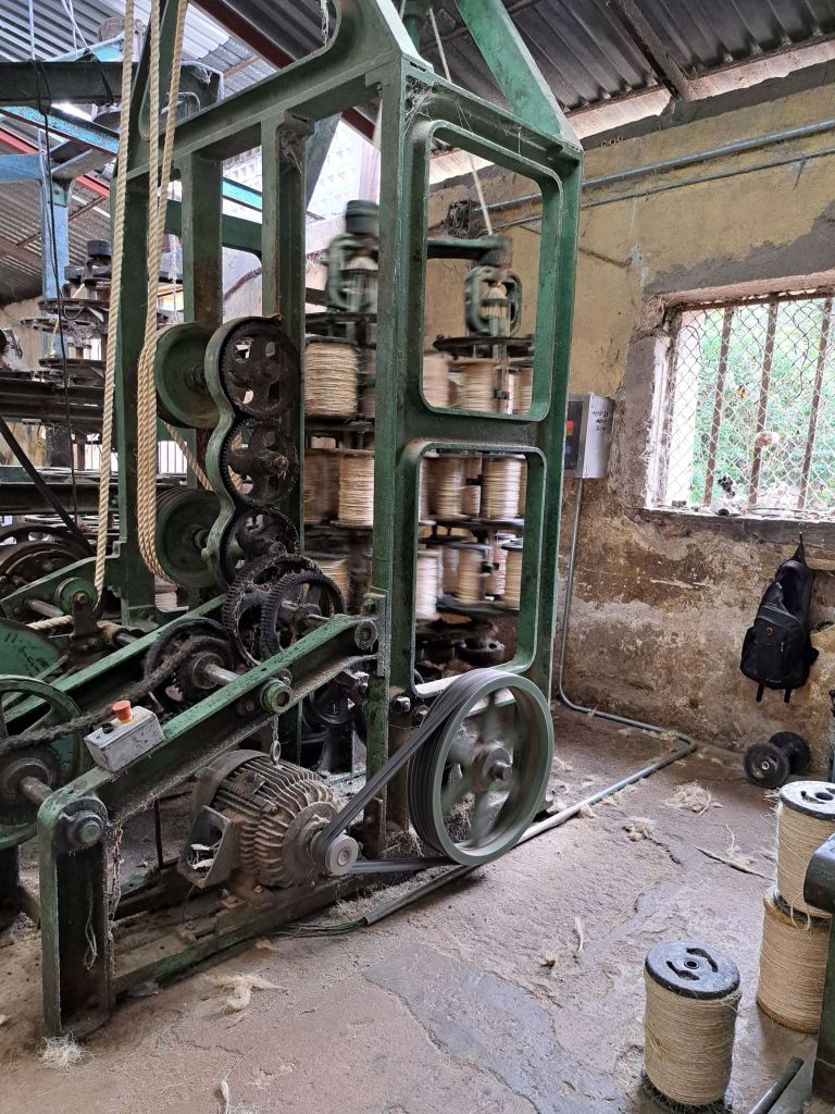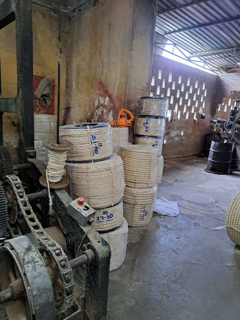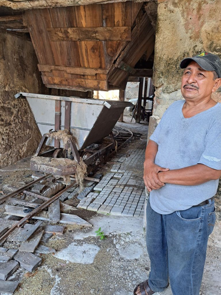 Carlos zeigt uns den gesamten Betrieb und erklärt mit viel Enthusiasmus die Herstellung vom Blatt bis zum Seil. Die Mayas kannten die Herstellung der Fasern schon und nutzten sie z.B. zum Nähen inkl der scharfen Blattspitze. Besonders die Maschine, die die Fasern aus dem Blatt gewinnt, hat es uns angetan. Sie ist von 1853 und noch in Betrieb.