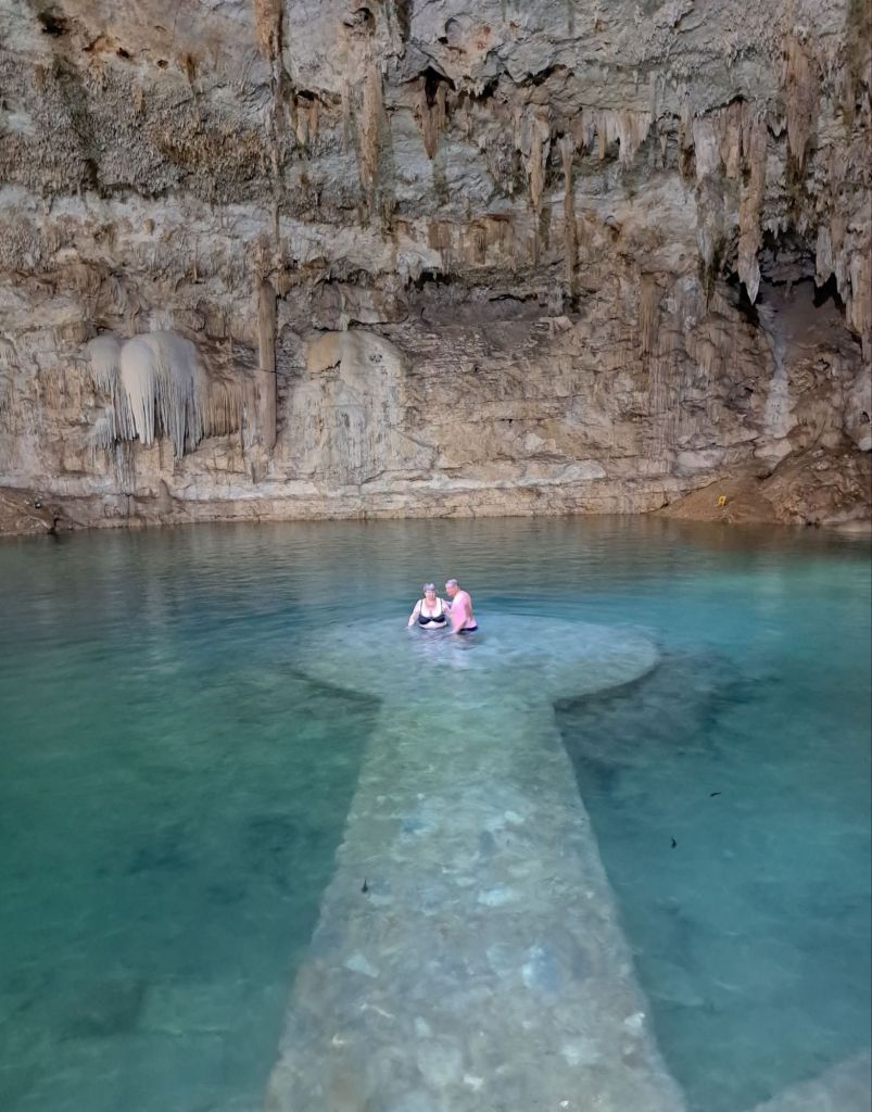 Bevor wir wieder zurück an der karibischen See sind, zeigt uns Manuel seine Lieblingscenote. Fast alleine schwimmen wir ( ohne Schwimmweste!) im klaren tiefblauen unterirdischen See. Das Wasser ist erfrischend kalt. Wir blicken durch das kleine Loch in der Decke in den blauen Himmel. So schön, hier will ich bleiben.