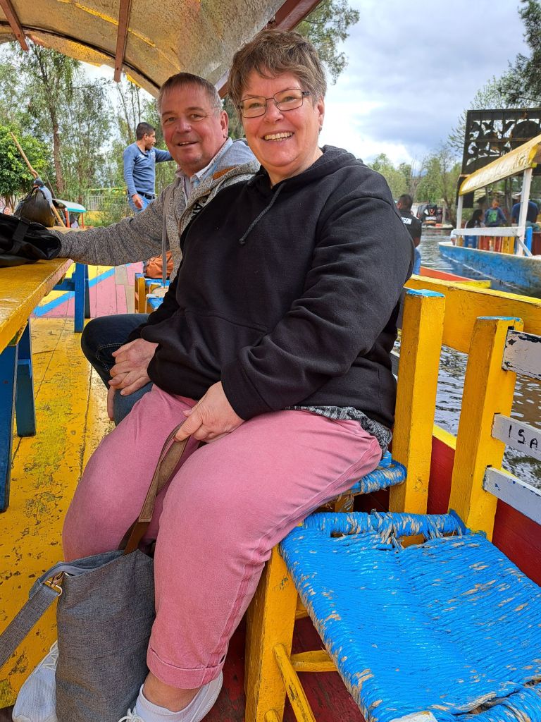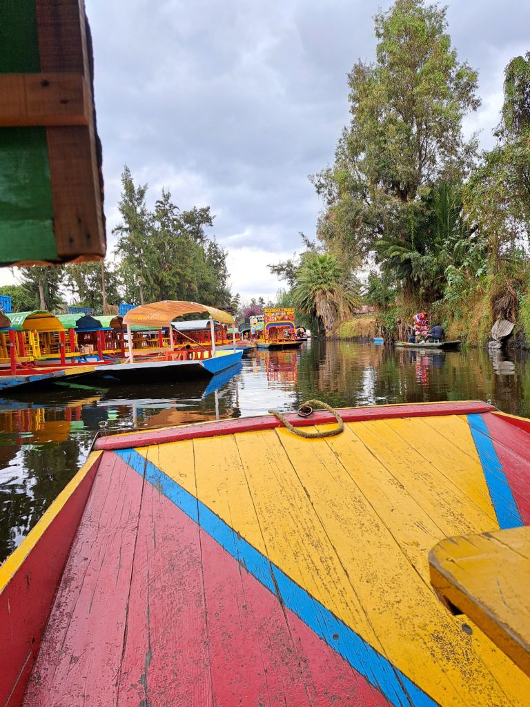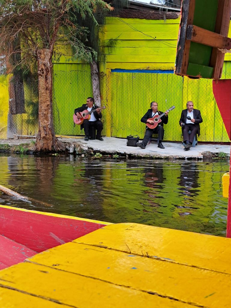 Später steigen wir ins Auto um und fahren nach Xochomilio, die schwimmende Stadt oder schwimmende Gärten genannt. Hier ist der See bzw. die alten Kanäle noch sichtbar und die Mexikaner fahren mit bunten Booten und feiern. Man kann sich essen oder Getränke von Händlerbooten kaufen, oder Musik bestellen. Es gibt Boote mit ganzen mexikanischen Kapellen oder mit der Marimba, dem mexikanischen Xylophon. Nach soviel Infos über Gebäude und Baustile eine super Entspannung. Es ist bunt, laut, chaotisch…einfach mexikanisch.