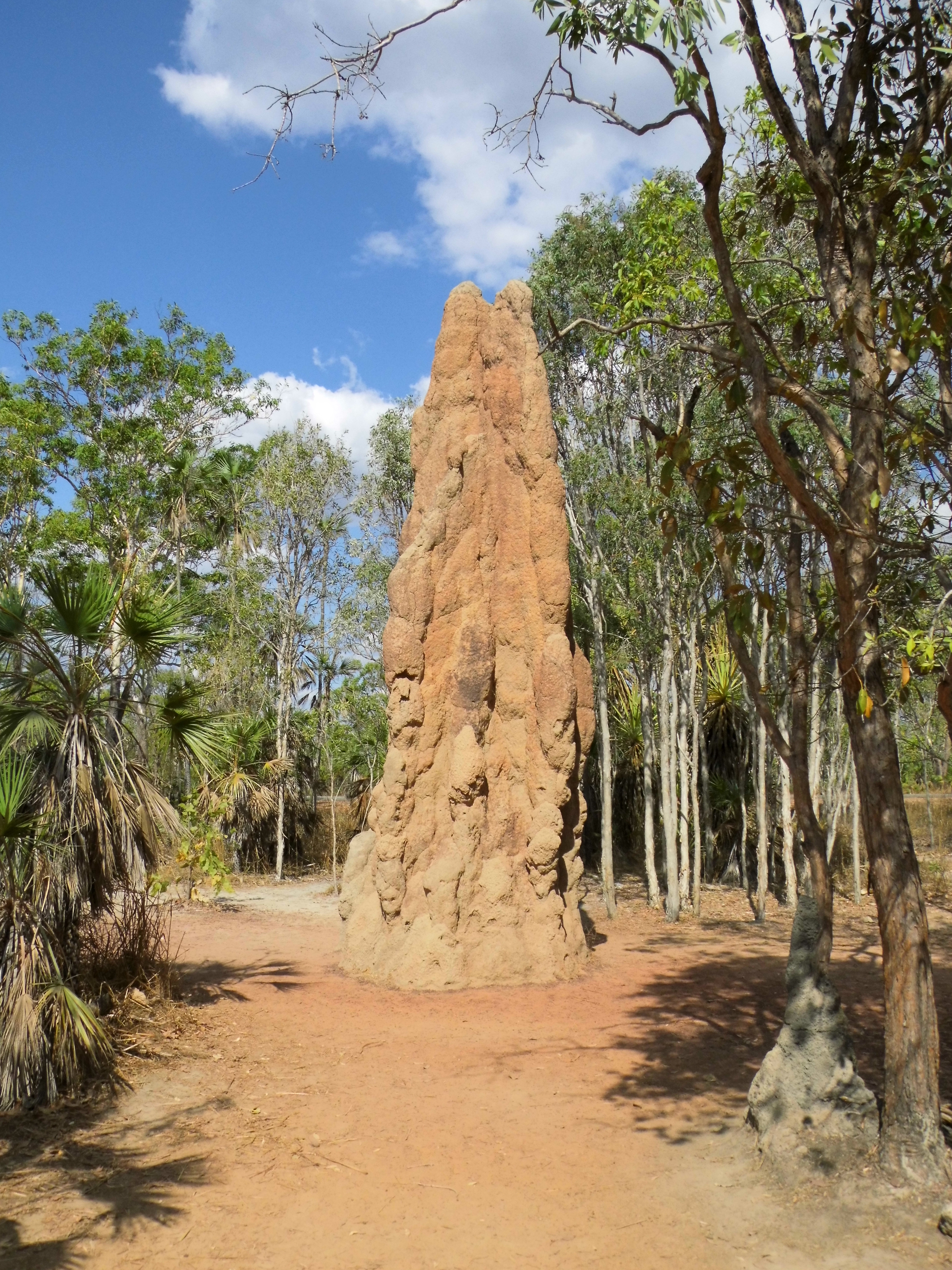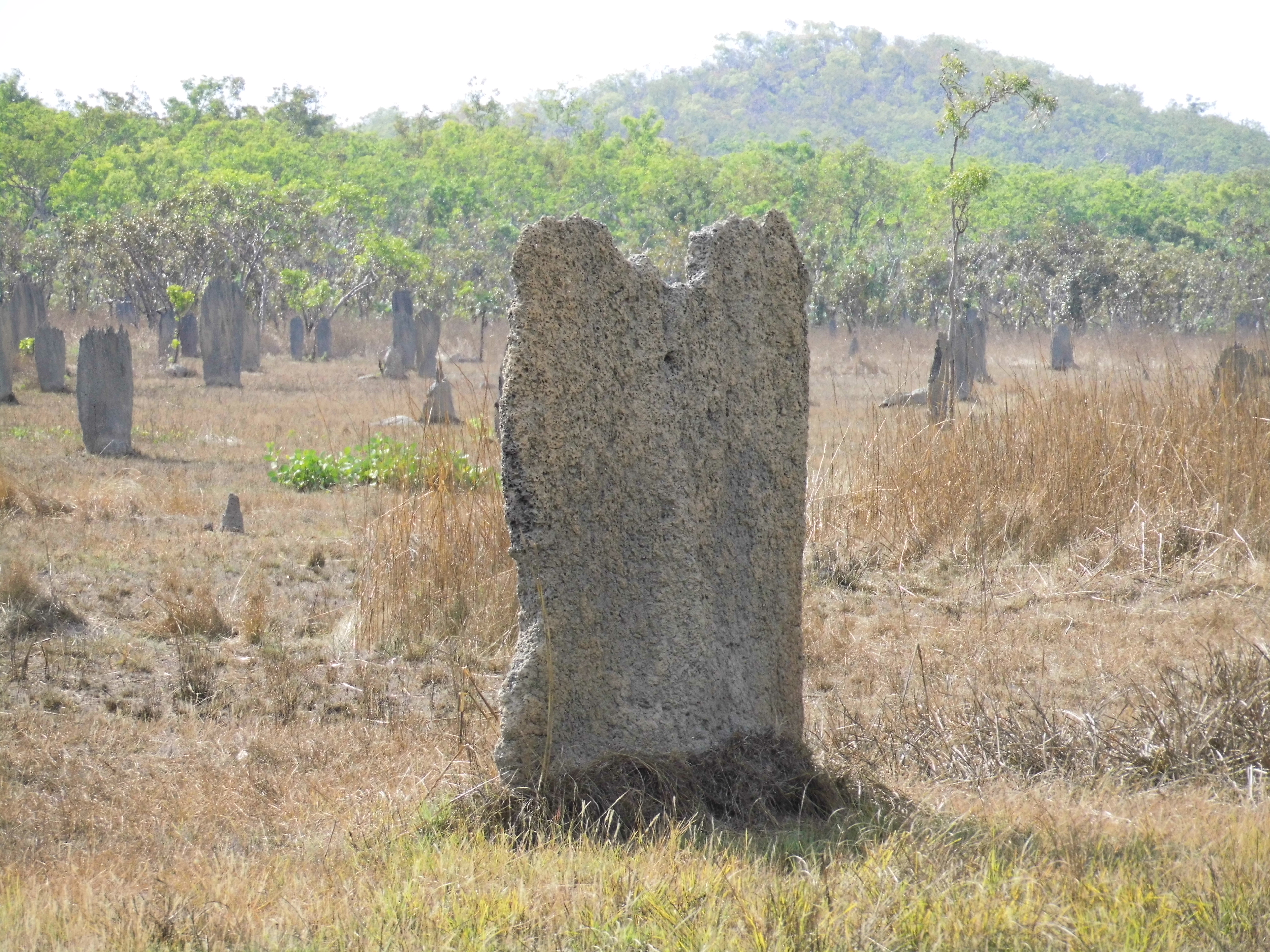 Rechts und links sehen wir viele Affenbrotbäume, sie wachsen hauptsächlich in Westaustralien und begrüßten uns schon an der Grenze. Ihre Stämme sehen aus wie dicke Flaschen mit einem Gewirr von langen Ästen auf dem Kopf, manchmal stehen zwei ganz dicht zusammen und sehen aus wie ein Liebespaar. Außerdem gibt es jede Menge Termitenhügel. Schon im Kakadu-NP haben wir viele gesehen, riesige Kathedralhügel- ähnlich wie die Sagrada Familia in Barcelona (nur nicht so hoch)-, dann welche die Grabsteinen glichen und streng nach der Sonne ausgerichtet waren. Später standen sie wie Säulen an der Straße und Witzbolde hatten hin und wieder welche mit T-Shirts verkleidet. Jetzt sind wir bei Hügeln, die eher wie ein großer Elefantenhaufen aussehen. Jörg meint: die hätten sich aber nicht viel Mühe gegeben.