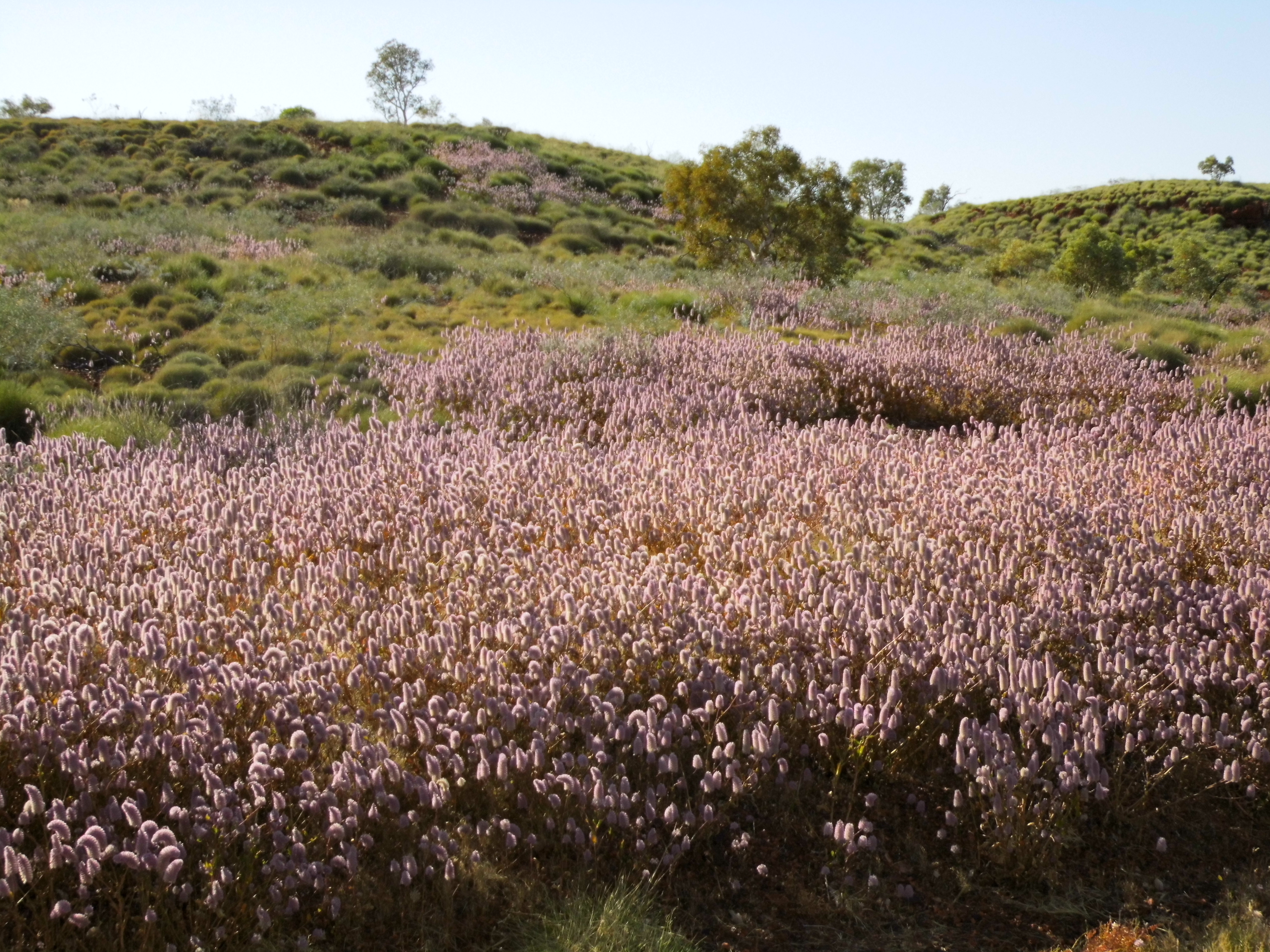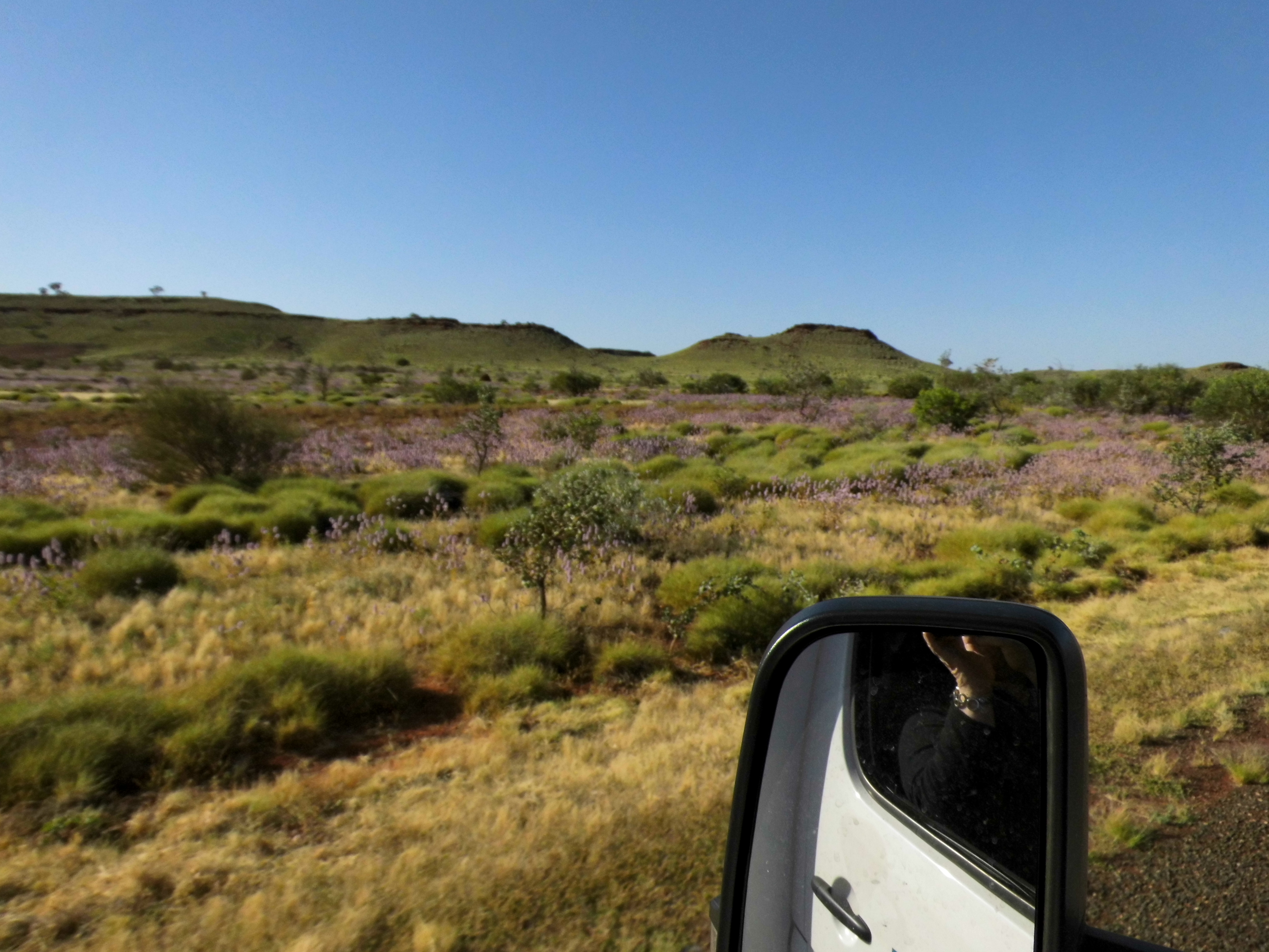 Das hatten wir auch noch nicht. Auf dem Parkplatz im Nichts erleben wir einen wunderschönen Sonnenaufgang. Kurze Zeit später machen wir uns auf den Weg. Nach einigen Kilometern ändert sich die Landschaft. In der Ferne ist ein Gebirgszug zu sehen. Rechts und links blüht Gestrüpp fliederfarben und rot und duftet sehr intensiv.