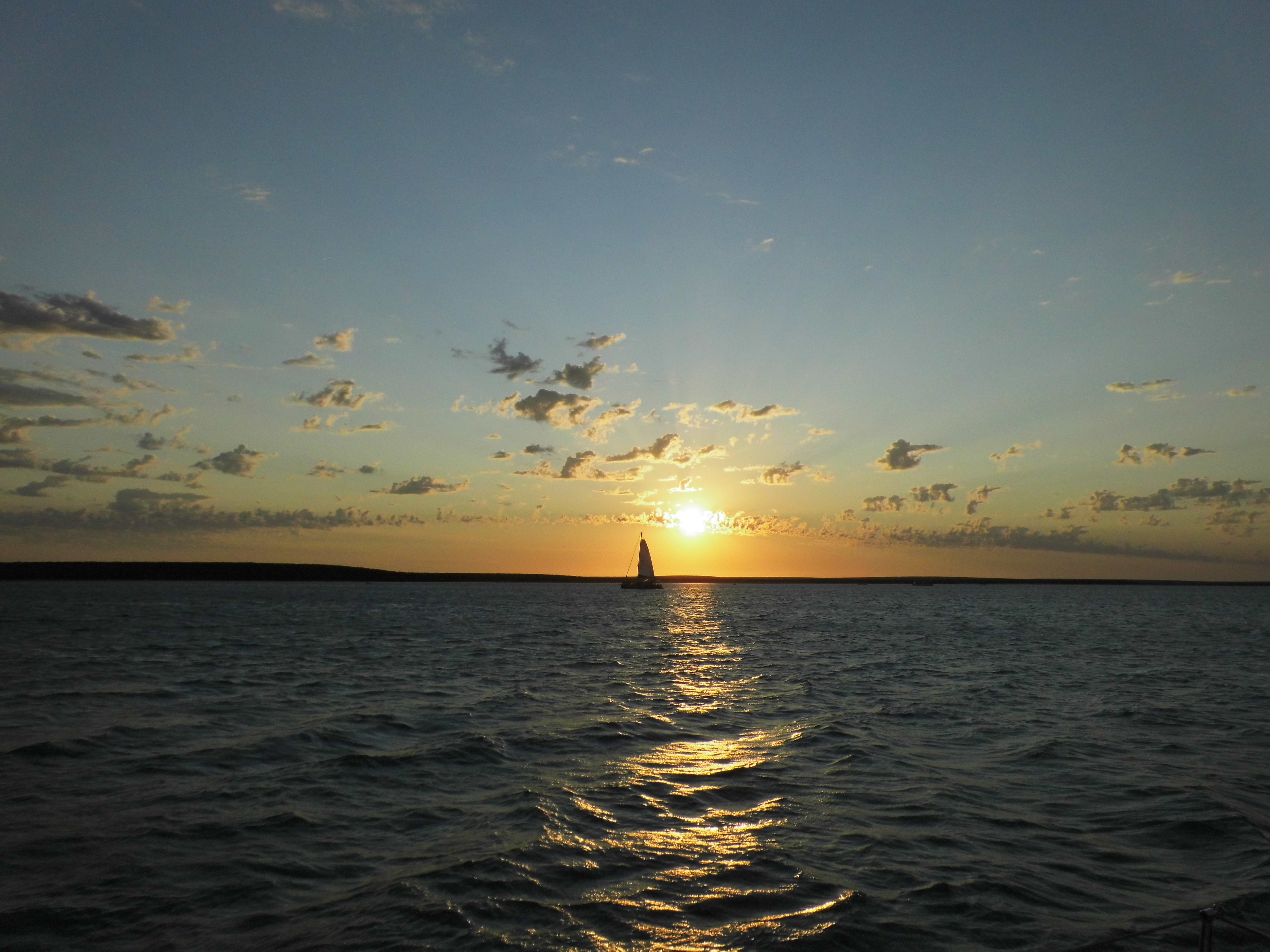 Wir starten kurz danach zu einer Katamaran-Fahrt um den Tag ausklingen zu lassen und noch ein wenig mehr Tiere zu beobachten. Das Gebiet gehört zur Shark-Bay, Weltnaturerbe und Lebensraum vieler Haie, Dungons usw. Diese wollen nicht gefunden werden, aber die Sonne färbt das Meer in schwerfließendes Silber, später in Göldtöne. Die Segel flattern über unseren Köpfen, aus den Lautsprechern ertönt: A Beautiful Day, die Sonne geht unter. Mehr geht nicht.