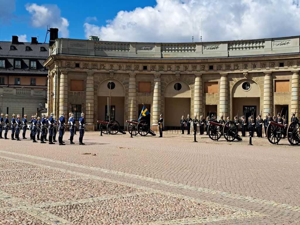 Am Schloss wird der Vorplatz plötzlich abgesperrt und als neugierige Touristen bleiben wir natürlich stehen. Gleich muss hier etwas passieren. Es kommt aber keine königliche Hoheit, oder so, vorgefahren sondern die tägliche Wachablösung beginnt.