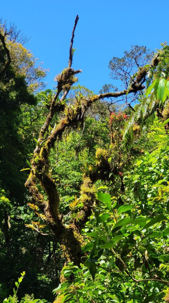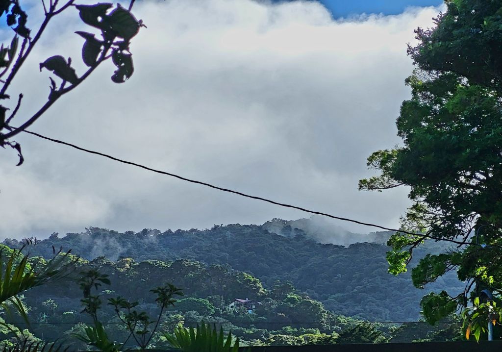 Eigentlich dachte ich der Nebelwald ist nebeliger, aber tatsächlich sind die Wolken noch ganz schön hoch und ziehen schnell über die Berge. Nebelwald entsteht, weil die feuchten Winde von der Karibik auf die kalten Berge treffen. Dort kondensiern sie und fallen als Nebel herab. Oft ist Nieselregen . Das feuchtwarme Klima führt zu einer üppigen, immergrünen Vegetation mit Planzen die nur hier gedeihen. Auf 1200 m Höhe herrschen ständig Temperaturen um die 25 Grad.