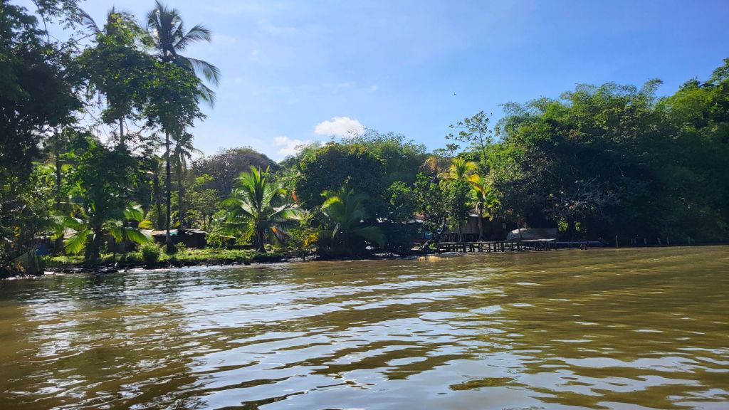 Der Weg dorthin ist mühselig. Es geht ca 30 km über eine Schotterpiste. Durch große Bananenplantagen von Chiquita und Del Monte. Dann steigt man in ein Boot um und fährt zwei Stunden durch die Lagune um im Ort anzukommen.