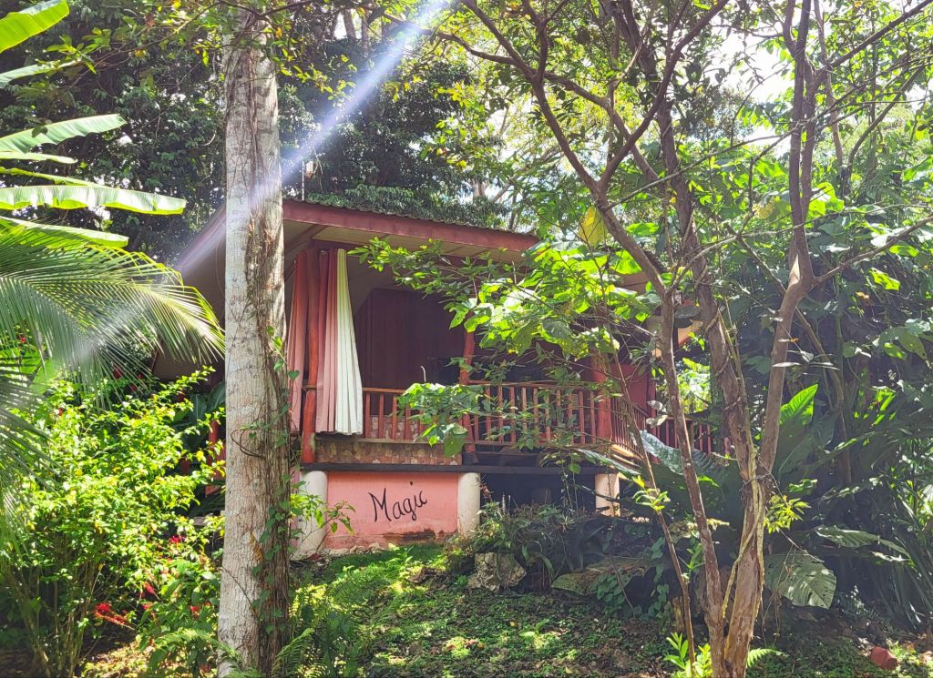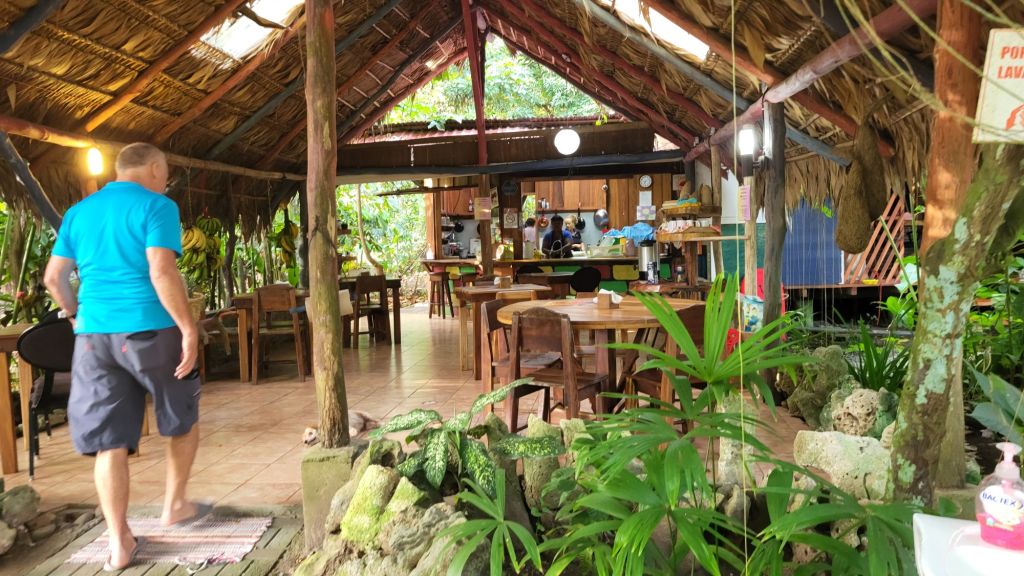 Ups, was habe ich denn da gebucht. Das war mein erster Gedanke als wir bei Brigittes Farm in Cathuia ankamen. Eine freundliche Schweizerin mir Rastalocken begrüßt uns . Zeigt uns erstmal die Faultiere die in ihren Bäumen über dem Frühstücksplatz leben und sagt dann wir müssen jetzt mit dem Auto zur Lodge fahren. Steigt mal ein, neben dem Hund ist noch Platz, und stört euch nicht an den Pferdesachen. Wir fahren eine kurze Strecke in den Wald. Dort stehen zwei kleine Holzhäuser. Sonst gibt es nur Natur . Wir merken schnell dass es eine kleine Oase ist. Das Meer ist nur 200 Meter entfernt und der kleine Ort ist auch nicht weit weg. Zum Frühstück müssen wir ca. 500 m laufen. Brigitte ist vor 40 Jahren dort hängen geblieben und hat die kleine Farm gegründet. Sie bietet Reittouren , Nachtwanderungen und Kochkurse an.